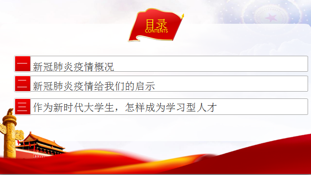 本次思政第一课的内容分为三大部分:一、新冠肺炎疫情概况 二、新冠肺炎疫情给我们的启示 三、作为新时代大学生,怎样成为学习型人才。