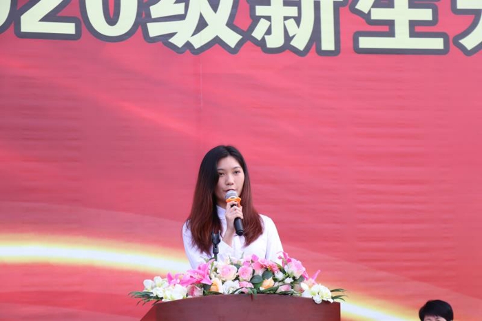 学生代表陈馨研与新生共勉“年轻允许失败,尝试是一种胜利”,她希望新生们能够在大学期间,自己学会照顾自己,学会理解和关爱,与同学、老师积极交流,友好相处,抓住学校、社会各种实践机会,凭借自己的智慧与能力,实现自己的梦想。