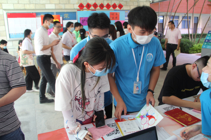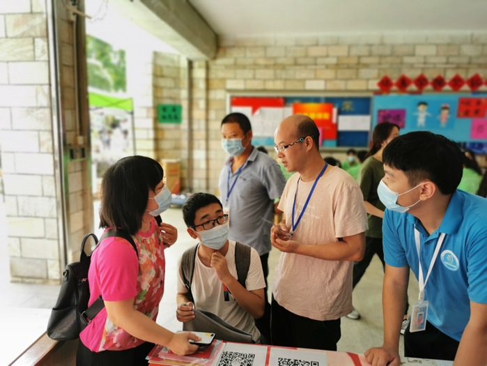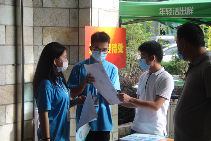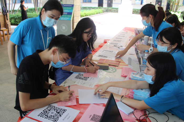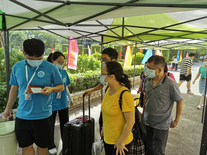虽然现在已经是九月中旬,但天气仍是炎热,迎新工作人员穿着鲜艳的会服,尽管鲜艳的会服已经被汗水浸透,但所有工作人员仍然微笑着解答新生的问题,热情地介绍着学校的情况。