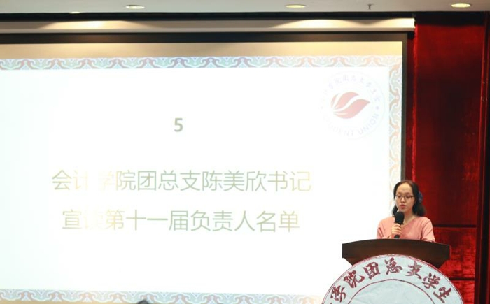 会计学院团总支陈美欣书记宣读新一届学生会各部门负责人名单,向新部门负责人表示热烈祝贺,让实习生们对团总支学生会有了进一步的了解。