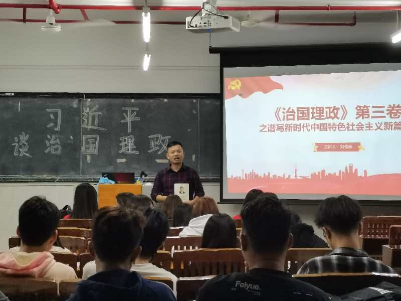 2020年11月2日晚上7点30分在西一教学楼403开展了《习近平谈治国理政》第三卷的授课活动。参与人员有国贸学院党总支党建小组队长以及2020级金融管理班学生。主题是“谱写新时代中国特色社会主义新篇章”。本次活动由国贸学院第二党支部书记刘伟鑫老师进行演讲。