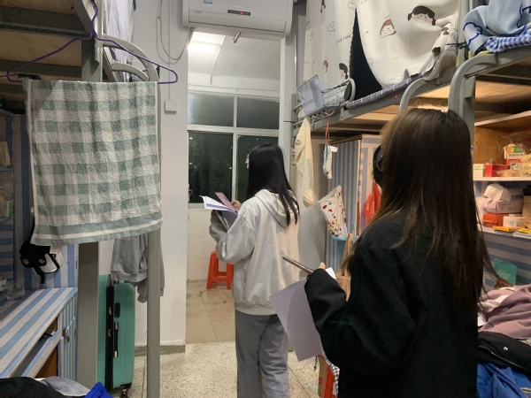在文明宿舍评比的过程中,各部门实习生文明有礼,敲门经允许后才进入学生宿舍进行考察。且在小组成员进行考察时,发现许多同学都能够把宿舍整理得井然有序,整洁,有些学生还为自己的宿舍增添了许些装饰品让宿舍更加美观。