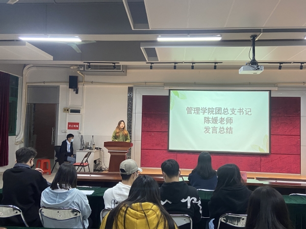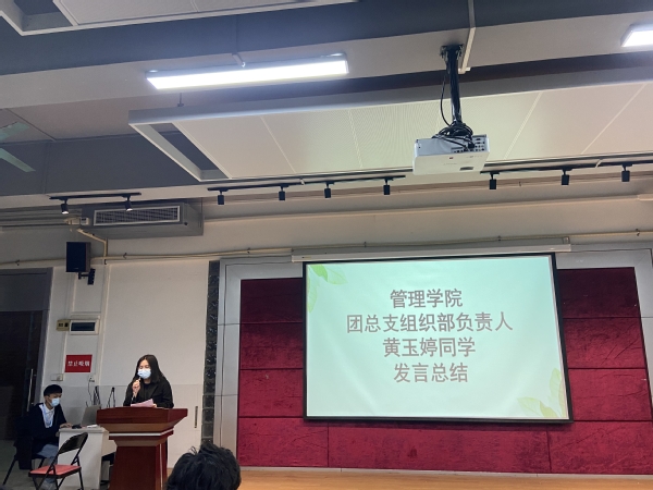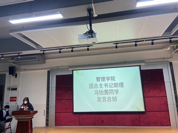 随后由管理学院团总支记助理冯怡茵同学上台为大家总结这一学期的工作,她强调了团支书工作的重要性,同时鼓励同学们做到“在其位,谋其职”。身为团支书更应该做到完善自我,不辞辛苦,服务他人,从而引导班上的团员提升凝聚力,不忘初心,积极向更高思想靠拢。