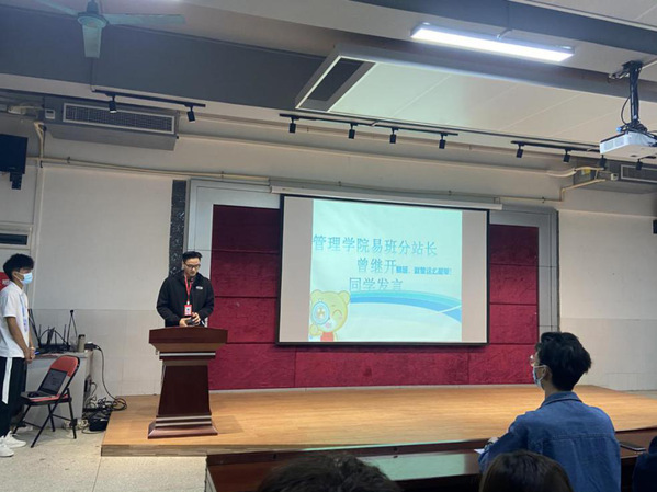 大会开始,首先由管理学院易班分站长曾继开上台总结这一学期的工作,他表示:在这一学期易班平台进行了20级班干部投票,学生手册考试,四史教育考试等等之类活动,在易班的活跃度提高的同时也出现许多不足的地方,他对各位易班班长的配合工作和对易班工作的支持表示感谢并希望在接下去的日子大家可以以更积极的面貌面对易班工作,改正不足。他相信在各位易班班长和工作人员的一起努力下,易班工作一定会越来越好,越来越有进步。