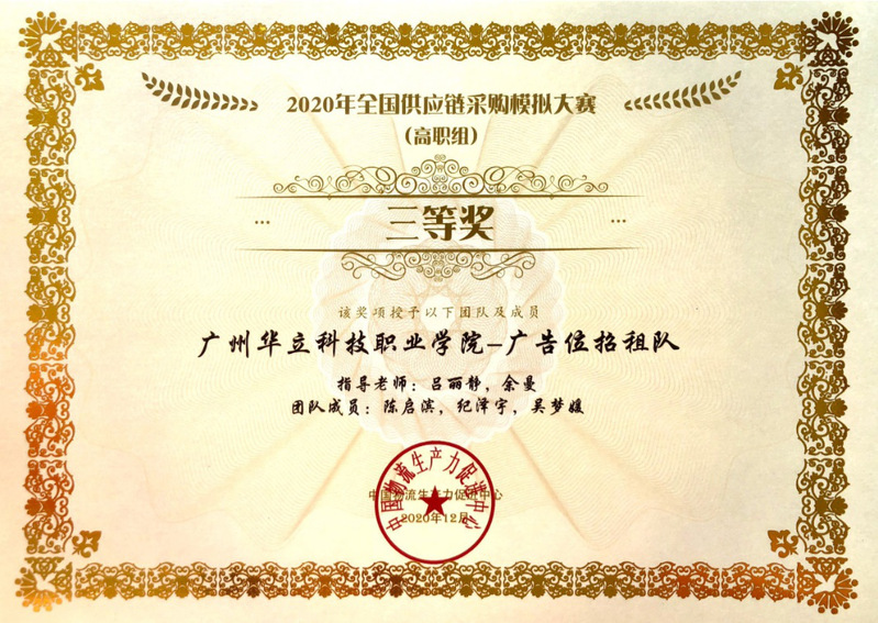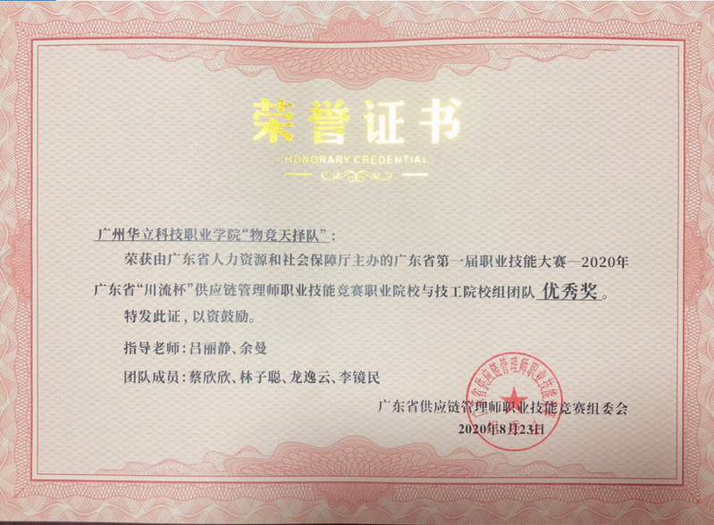 2020-2021学年第一学期,在全体物流老师和学生的努力下,在学生竞赛和教师教学能力比赛上均有获奖,其中学生竞赛方面,参加了2020年全国供应链采购模拟大赛,获得全国三等奖;参加2020年广东省“川流杯”供应链管理师职业技能竞赛,获得优秀奖。