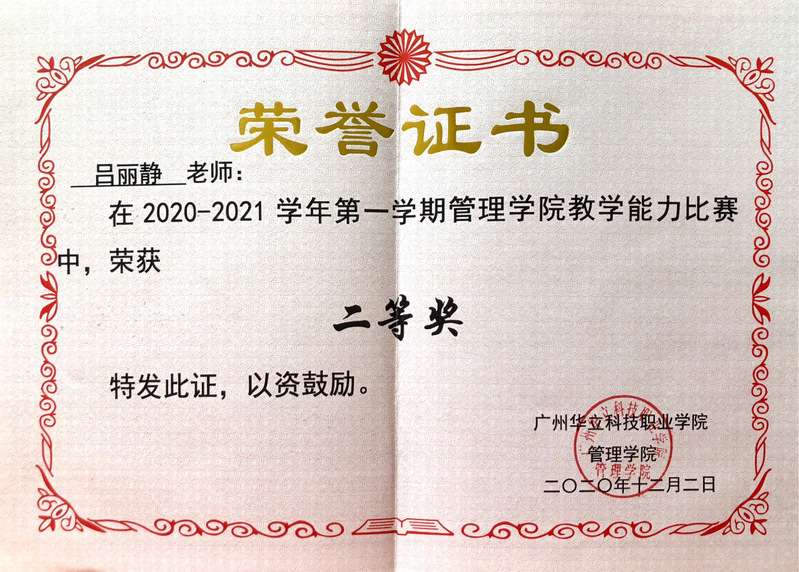在教师教学能力竞赛中,参加了管理学院举办的教师教学能力比赛,其中吕丽静老师获得二等奖。