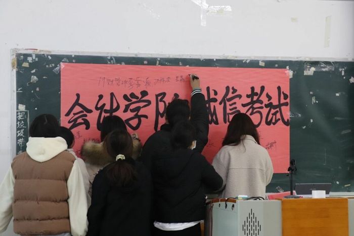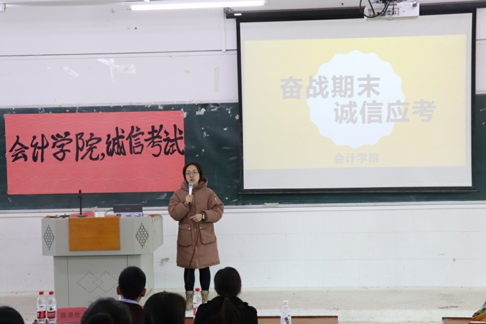 20201231日,会计学院在图书馆201召开了期末诚信备考活动,莅临的领导和嘉宾有:会计学院学管副主任陈辉老师、校内教学副主任杨素芹老师、团总支陈美欣书记、辅导员王冠飞老师、陈湛通老师、实习辅导员曾文樑老师。