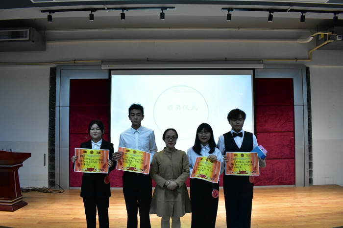 通过三轮比拼,根据评委评分,得出比赛结果,由主持人公布:第一名:陈哲、第二名:梁彦、第三名:李泽宇、人气奖:赖莹莹,并由会计学院团总支书记陈美欣老师为他们颁奖。