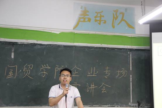宣讲会第一项,由国贸学院校外教学主任李远兴老师做会前动员讲话,并介绍莅临本次宣讲会的领导嘉宾,他并表示到,希望同学们可以在本次宣讲会当中了解贝乐公司并可以明确自己的就业方向。