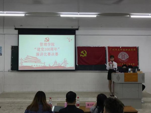 广州华立科技职业学院管理学院建党一百周年演讲比赛决赛在2021年4月27日5:40分在图书馆604举行,主题为“青春心向党,建功新时代”。