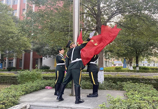 由主持人宣布升旗仪式正式开始,国旗护卫队成员迈着铿锵有力的步伐来到了国旗台下,伴随着庄严嘹亮的国歌声,鲜艳的五星红旗冉冉升起,迎着朝阳随风飘扬,全体师生行注目礼。