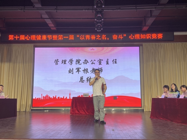 最后由管理学院办公室主任刘军根老师上台总结讲话,首先恭喜获奖队伍。他希望以此活动为契机,让更多同学参与进来,通过各项活动与途径,加强心理健康知识的学习和传播,普及健康心理知识,提高大学生的心理素质和处理心理问题的能力。他呼吁广大青年学生一定要积极响应习近平书记的号召,立志做一名德才兼备、身心健康的社会主义建设者和接班人。