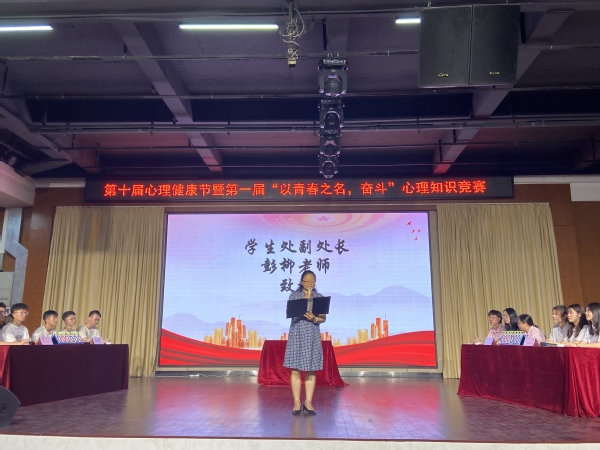 紧接着由学生处副处长彭柳老师对本次比赛致辞,她表示:关注大学生心理健康积极开展大学生心理健康教育,引导学生健康成长是心理健康教育工作的重要内容。她希望同学们通过此次活动能进一步加强自身心理健康,积极调整自己的状态。并对在本次比赛准备中投入了极高热情与付出辛勤汗水的老师及工作人员表示慰问与感谢,最后预祝本次心理知识竞赛取得圆满成功。