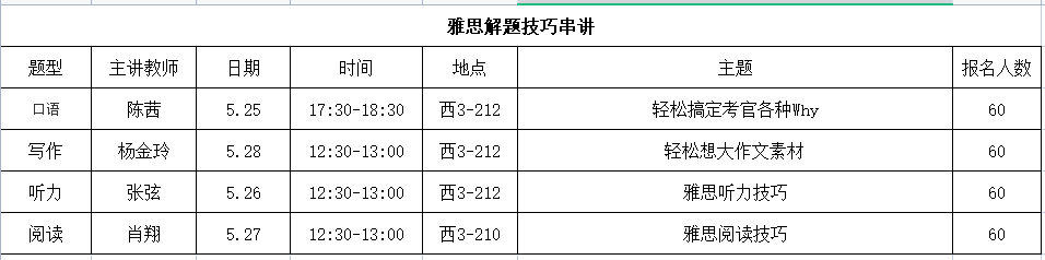 为提升我校学生雅思考试解题技巧,国际经济与外语学院国际班教师将针对考试模块进行串讲,具体安排如下: