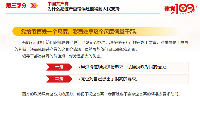 中国共产党坚定地捍卫国家民族利益、中国共产党解决了农民的土地问题、共产党实行了高度的民主、共产党人高度廉洁。中国共产党的政策和行动赢得了最大多数中国人的支持。