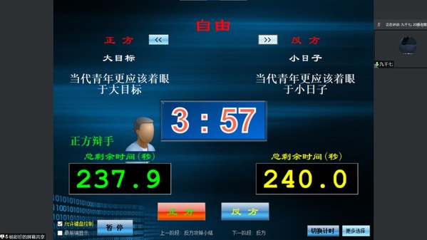 在本次辩论赛的决赛中,对阵双方分别是持正方观点“当代青年更应该着眼于大目标”的20物流班以及持反方观点“当代青年更应该着眼于小日子”的20市营2班。在分别进行自我介绍以后,辩论赛即将拉开帷幕。按照新加坡赛制,正、反双方一辩各自提出自己的立论,随即进入一对一攻辩环节,然后是精彩的自由辩论环节。在这个环节中,双方势均力敌,进行了唇枪舌战,随着铃声的响起,这一环节在双方对手不可开交的辩论中结束。