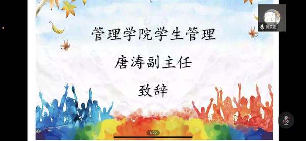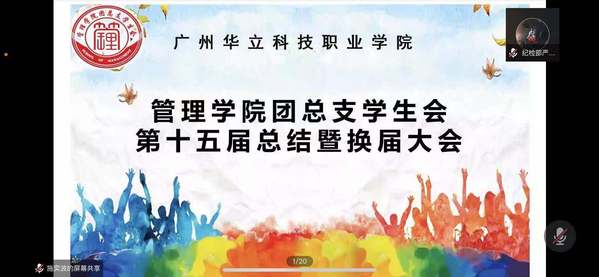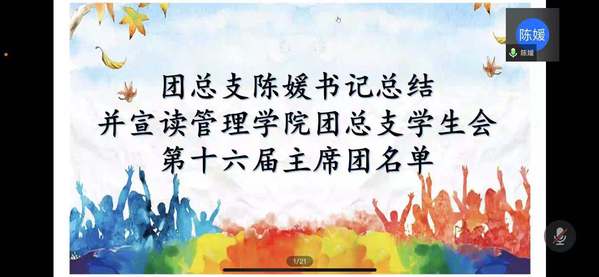 2021年6月17日于线上腾讯会议举办管理学院团总支学生会第十五届总结暨换届大会,参加本次会议的领导和嘉宾有管理学院管理副主任唐涛老师、管理学院团总支书记陈媛老师、辅导员戴双雅老师、辅导员熊灵芝老师、辅导员张南南老师、辅导员邓念平老师、辅导员吴小宇老师、管理学院团总支学生会第十五届主席团成员以及新一届主席团成员和各部门部长和成员。