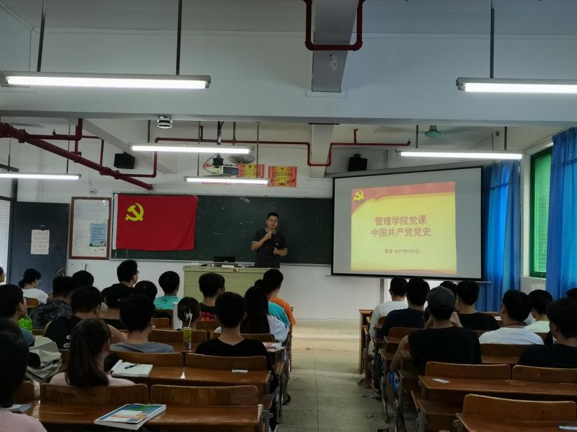 学史明理、学史增信、学史崇德、学史力行,学党史、悟思想、办实事、开新局,2021年9月9日,管理学院在西三503开展了以党史学习教育及爱国主义为主题的党课,本次党课由管理学院党总支副书记唐涛主讲,管理学院20级学生干部参加党课。