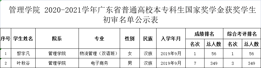 根据《关于做好我校2020-2021学年国家奖助学金评审的通知》文件的有关要求,经学生本人申请,各班级民主评议,学院评定小组审核,我学院拟推荐黎宇凡、叶秋谷两位同学为2020-2021学年度国家奖学金学生。按照公开、公平、公正的原则,现将推荐名单予以公示,公示期为2021年9月26日-9月28日,如有异议,请在公示期内进行反映。