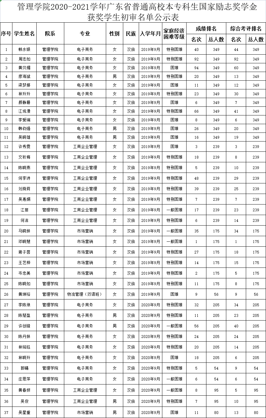根据《关于做好我校2020-2021学年国家奖助学金评审的通知》文件的有关要求,经学生本人申请,各班级民主评议,学院评定小组审核,我学院拟推荐赖水银等37位同学为2020-2021学年度国家励志奖学金获奖学生。按照公开、公平、公正的原则,现将推荐名单予以公示,公示期为2021年9月26日-9月28日,如有异议,请在公示期内进行反映。