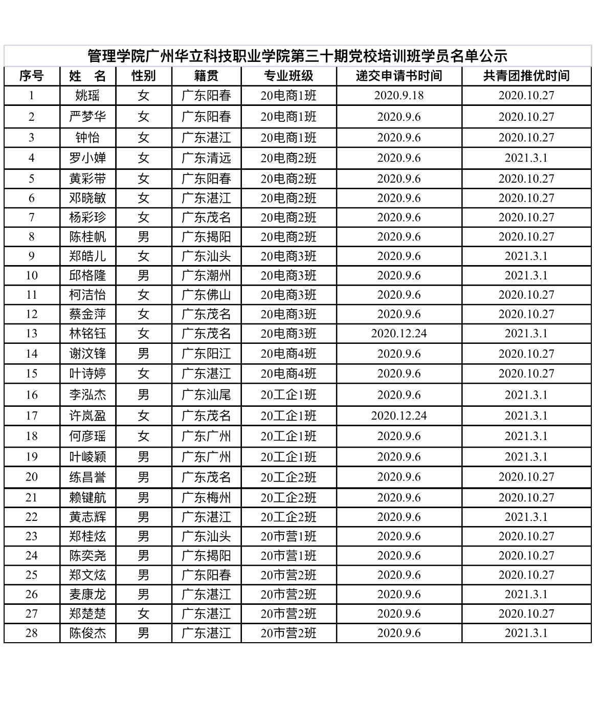 凡对确定以下同学为第30期党校培训班学员有意见及异议者,请在公示期内以书面形式向管理学院党总支或校党委办公室反映。