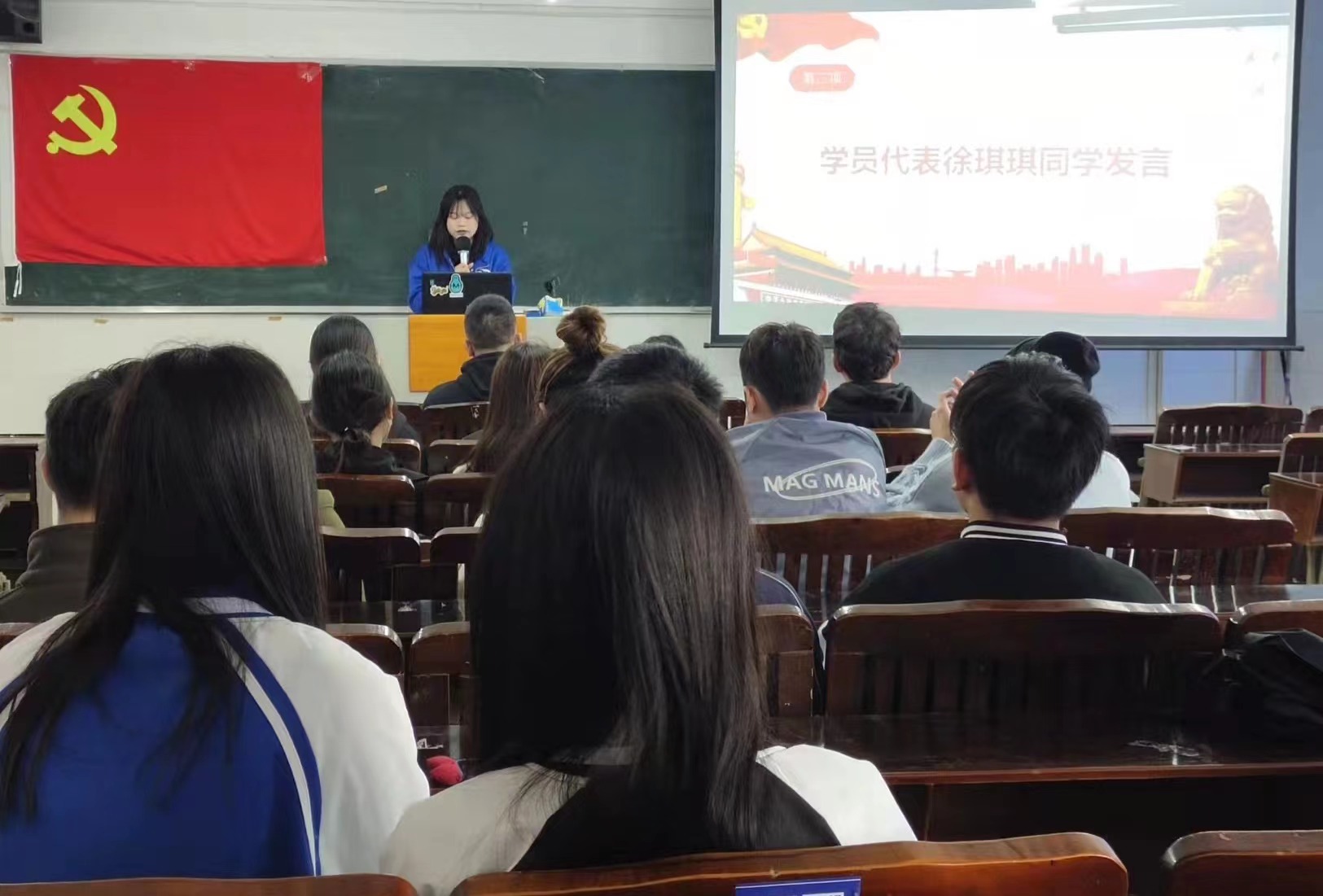 由学生代表徐琪琪同学发言,她表示感谢学校领导和党委组织给我们提供的这次机会,使我们更好的从思想上、作风上、行动上早日加入共产党。在党校学习期间,我代表第31期党校培训学员承诺,做到以下几点:第一,坚决做到不早退,努力学习课本知识,完成老师布置的作业;第二,严格要求自己,遵守学校规章制度,做好自己本职工作的同时帮助别人;第三,主动完善自己,积极向党组织靠拢,把自己锻炼成符合党和人民期望的合格的社会建设者的接班人,为中华之崛起,为民族之复兴尽我们的责任和义务。
