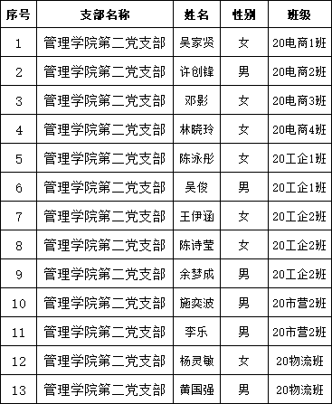 根据广州华立科技职业学院党委发展党员的要求,经本人申请及党组织培养和考察,2021年11月26日管理学院党总支讨论研究,拟将吴家贤等13名同志列为近期预备党员发展对象,总支将在近期召开党员大会讨论他们的入党问题,并上报党委。为了进一步增强发展党员的透明度,确保发展新党员的质量,根据《中国共产党发展党员工作细则(试行)》等文件的有关精神,现将发展对象的名单公示如下(具体名单见附件):