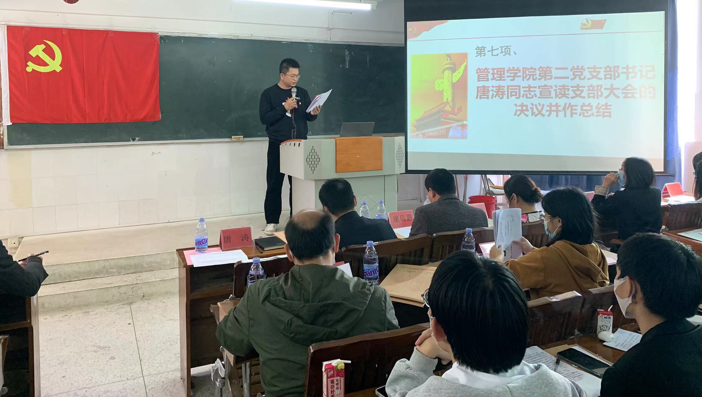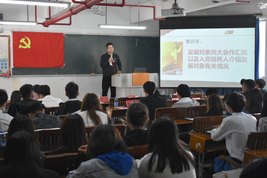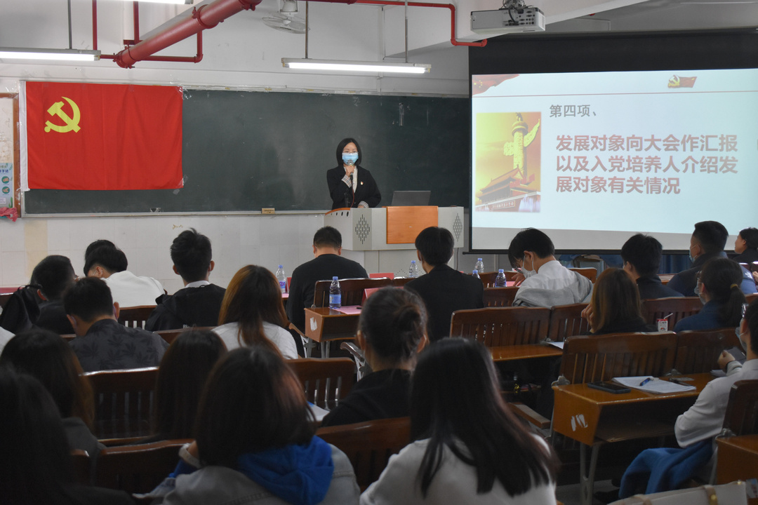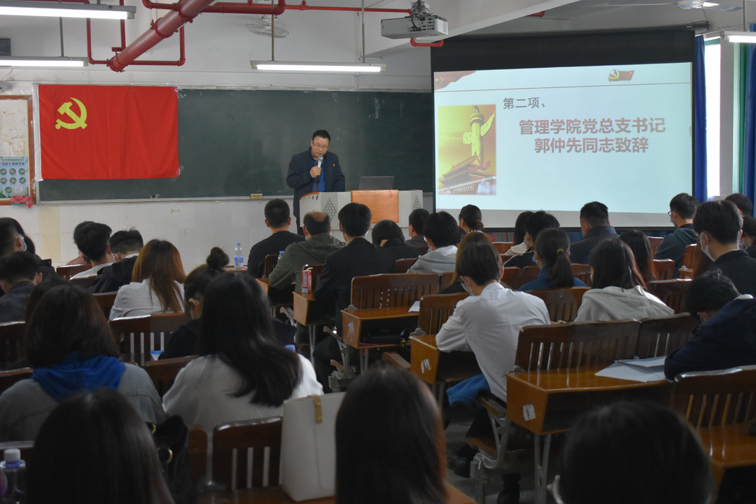 管理学院第二党支部于2021年12月8日于西三312教室召开一次支部大会,主要议题是讨论接收赖水银等24位同志加入中国共产党事宜。按照发展党员工作相关要求,本次24名发展对象经过支部一年以上的培养考察,履行政审、公示、集中培训和党委预审等程序后,现提交支部大会讨论、表决是否接收为预备党员。本次的参会人员有:管理学院党总支书记郭仲先同志、管理学院党总支副书记(二支部书记)唐涛同志、管理学院第一党支部书记康信恩同志、管理学院第二党支部组织(宣传)委员陈媛同志、管理学院第二党支部纪检委员戴双雅同志、全体教师党员、学生党员和党建小组成员。