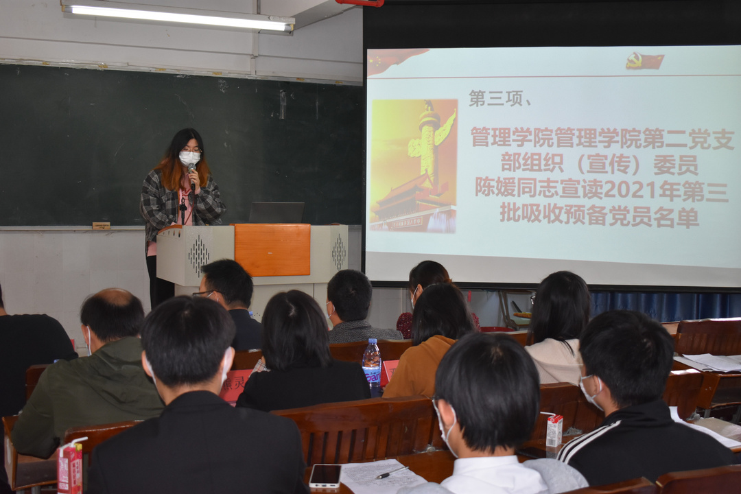 由管理学院第二党支部组织(宣传)委员陈媛同志宣读2021年第三批吸收预备党员名单。