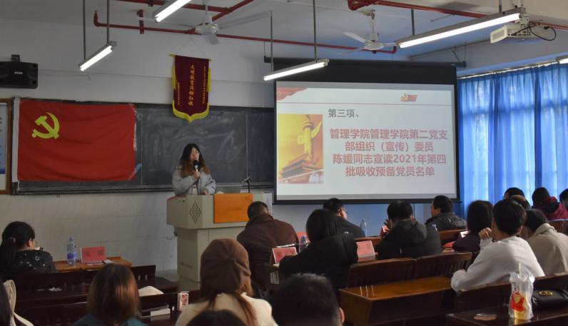 《管理学院第二党支部组织(宣传)委员陈媛同志宣读2021年第四批吸收预备党员名单》