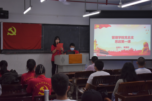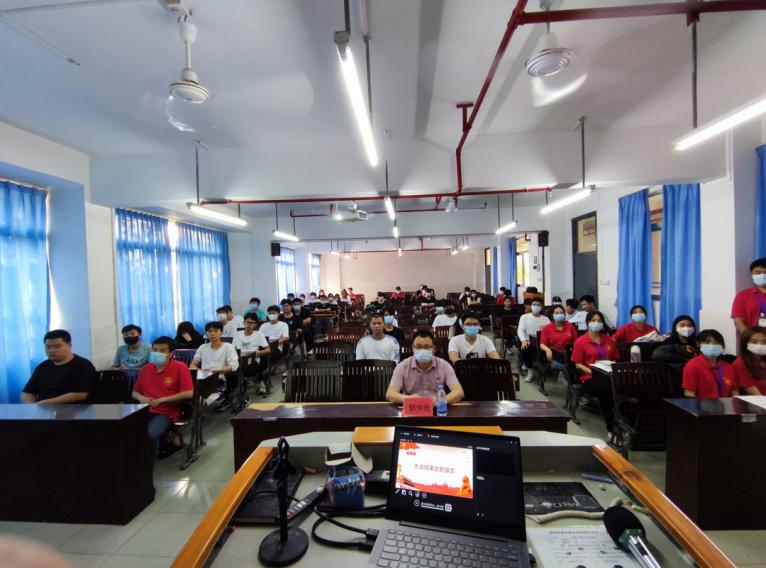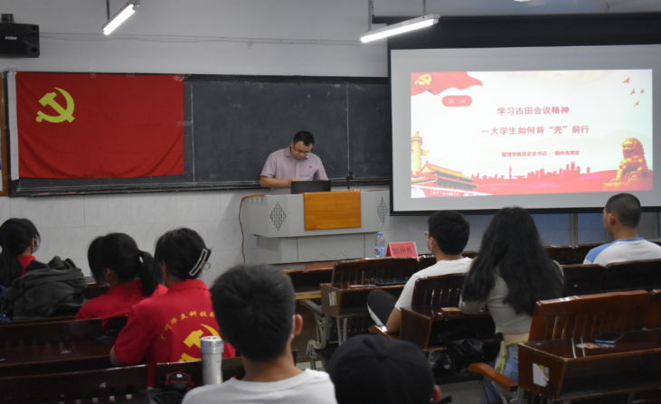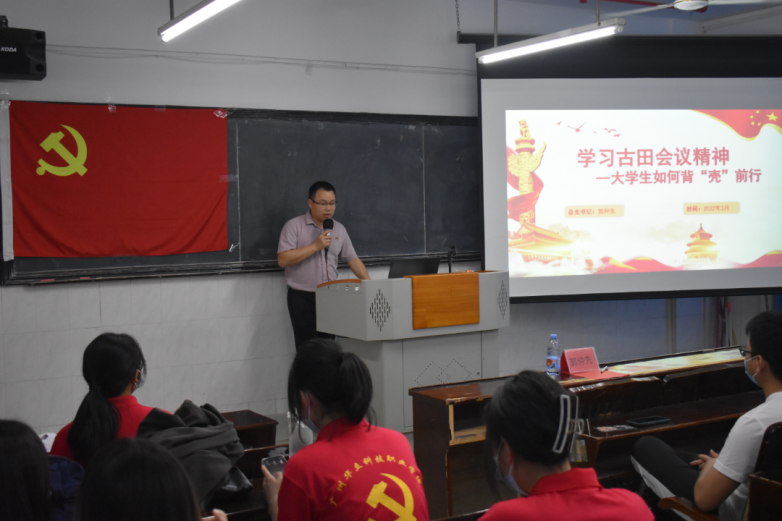 2022年3月17日下午4点,管理学院党总支书记郭仲先同志给团学、党建干部上了一堂题为“学习古田会议-大学生如何背‘壳’前行”的思政课。本次会议由陈宣廷同学主持。