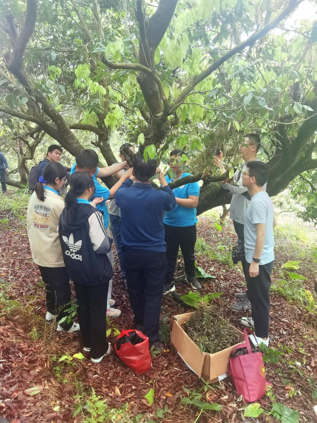 在参观学习之后,我院师生扛着大箱铁皮石斛苗,提着小袋工具材料,踏上了“荔枝树上种石斛”之路。连日的阴雨使荔枝树干充分湿润,这有利于铁皮石斛的生长,但也会让山路泥泞林下湿滑,而这些困难阻挡不了师生党员们澎湃的激情。