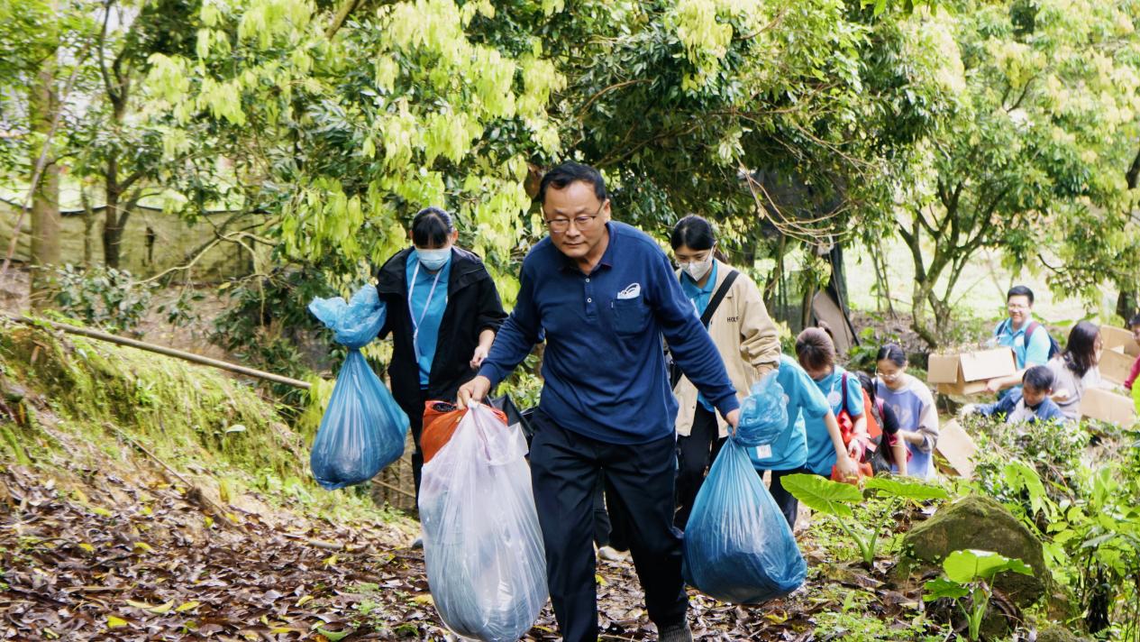 在参观学习之后,我院师生扛着大箱铁皮石斛苗,提着小袋工具材料,踏上了“荔枝树上种石斛”之路。连日的阴雨使荔枝树干充分湿润,这有利于铁皮石斛的生长,但也会让山路泥泞林下湿滑,而这些困难阻挡不了师生党员们澎湃的激情。