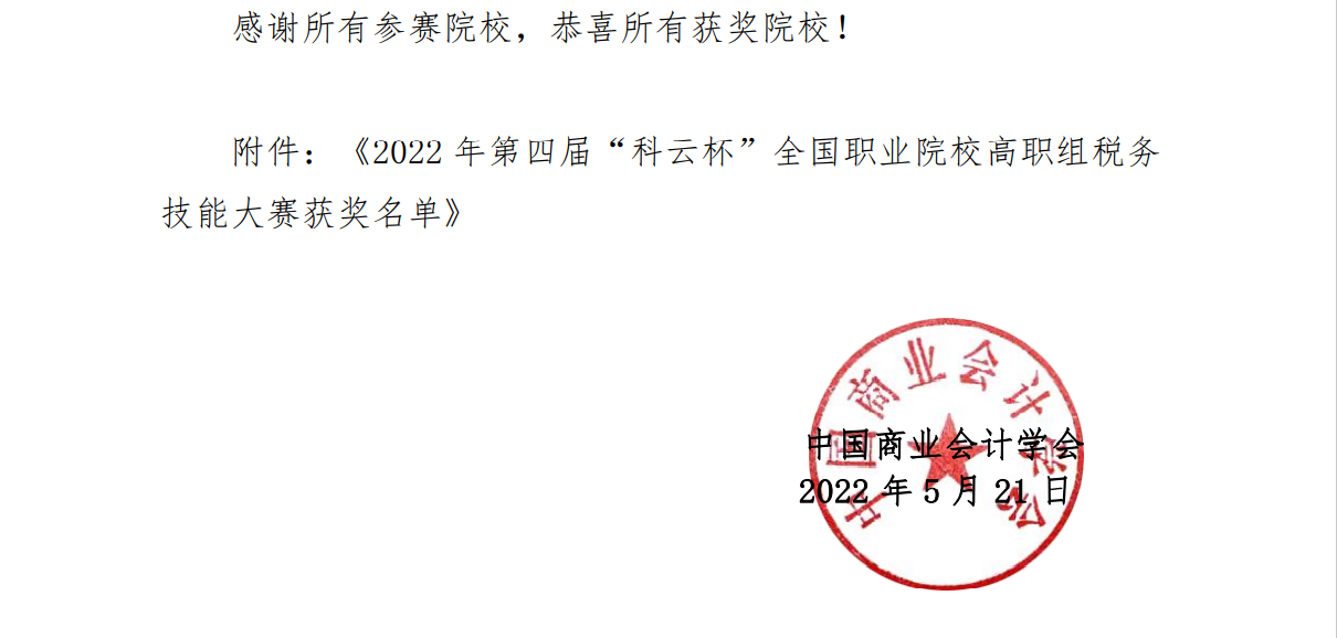 2022521日,由中国商业会计学会、全国财经职业教育集团主办的2022年第四届“科云杯”全国职业院校高职组税务技能大赛在云端成功举办。本届大赛历时2个多月,全国400多所院校共590多支队伍报名参赛。