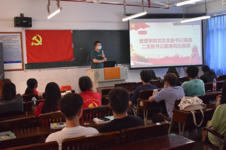 由管理学院党总支副书记(第二党支部书记)唐涛同志带领大家共同学习习总书记的讲话精神。在讲话中习近平总书记指出:新时代的广大共青团员,要做理想远大、信念坚定的模范;要做刻苦学习、锐意创新的模范;要做敢于斗争、善于斗争的模范;要做艰苦奋斗、无私奉献的模范;要做崇德向善、严守纪律的模范。青年是国家的希望,希望广大青年能学习贯彻习近平总书记的重要讲话,坚守理想信念、补足精神之钙,当前最重要的是,要坚定爬坡过坎的勇气、底气和信心。将理论学习与实际的工作相结合,更加深入理解习近平总书记在建团一百周年的讲话精神与思想。