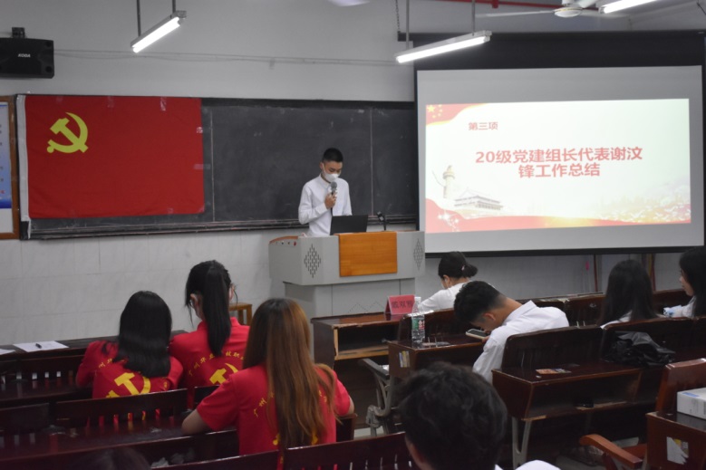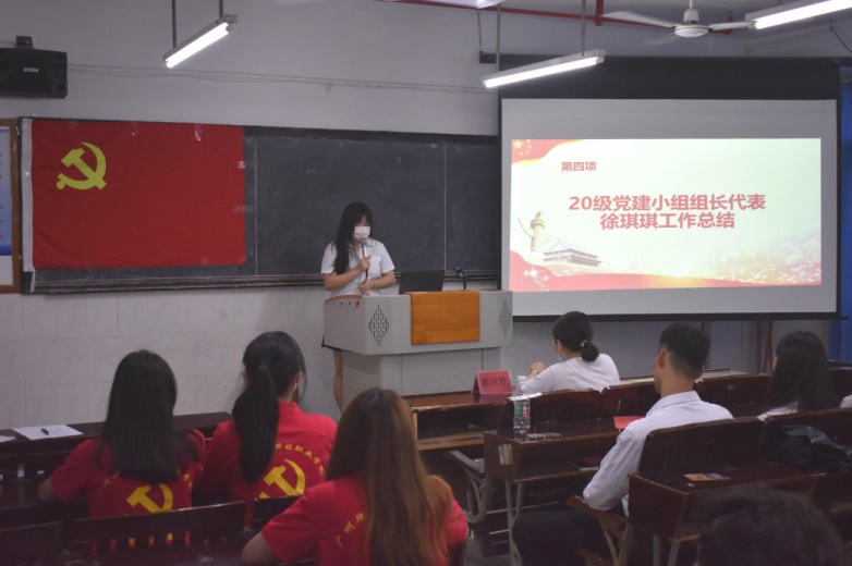 20级党建小组组长代表徐琪琪工作总结,她总结了这一学年以来获得的成绩与不足之处,并对以后的工作提出了要求以及改正的方法,最后她代表各位党建小组组长给新的党建干部送上鼓励和美好的祝福。