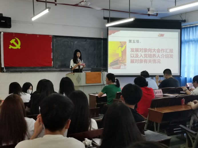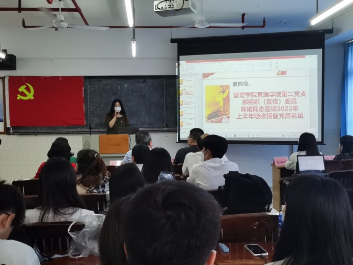 管理学院第二党支部组织(宣传)委员陈嫒同志宣读2022年上半年预备党员名单。