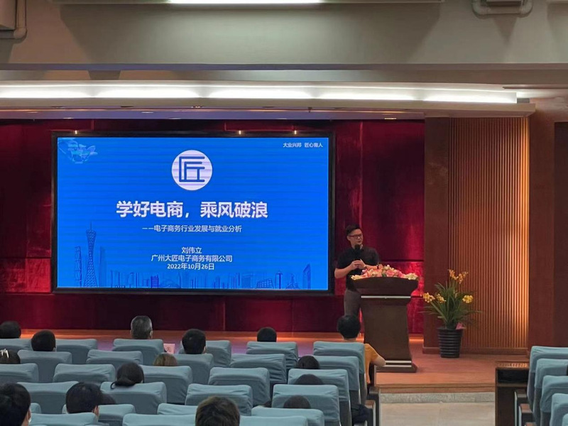 管理学院邀请广州大匠电子商务有限公司刘伟立总经理到学校1 号报告厅举行“学好电商 乘风破浪”演讲报告。刘总为学生详细讲述电子商务行业历史背景、发展前景、行业就业分析;并分享了自己的就业和创业历程,以自己经历给学生提出建议,1.保持激情不放松,弯道超车就看这三年,在校学习的三年成长是非常重要的;2.提前做好职业赛道规划,自己设定目标,努力成长;3.尽可能多参专业相关的实践活动,为将来踏出社会做好准备。
