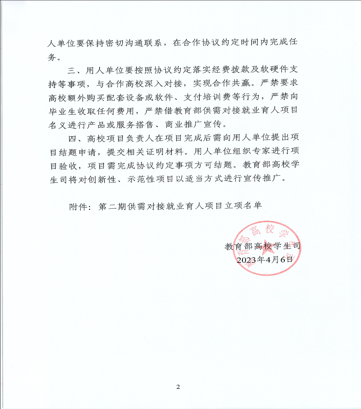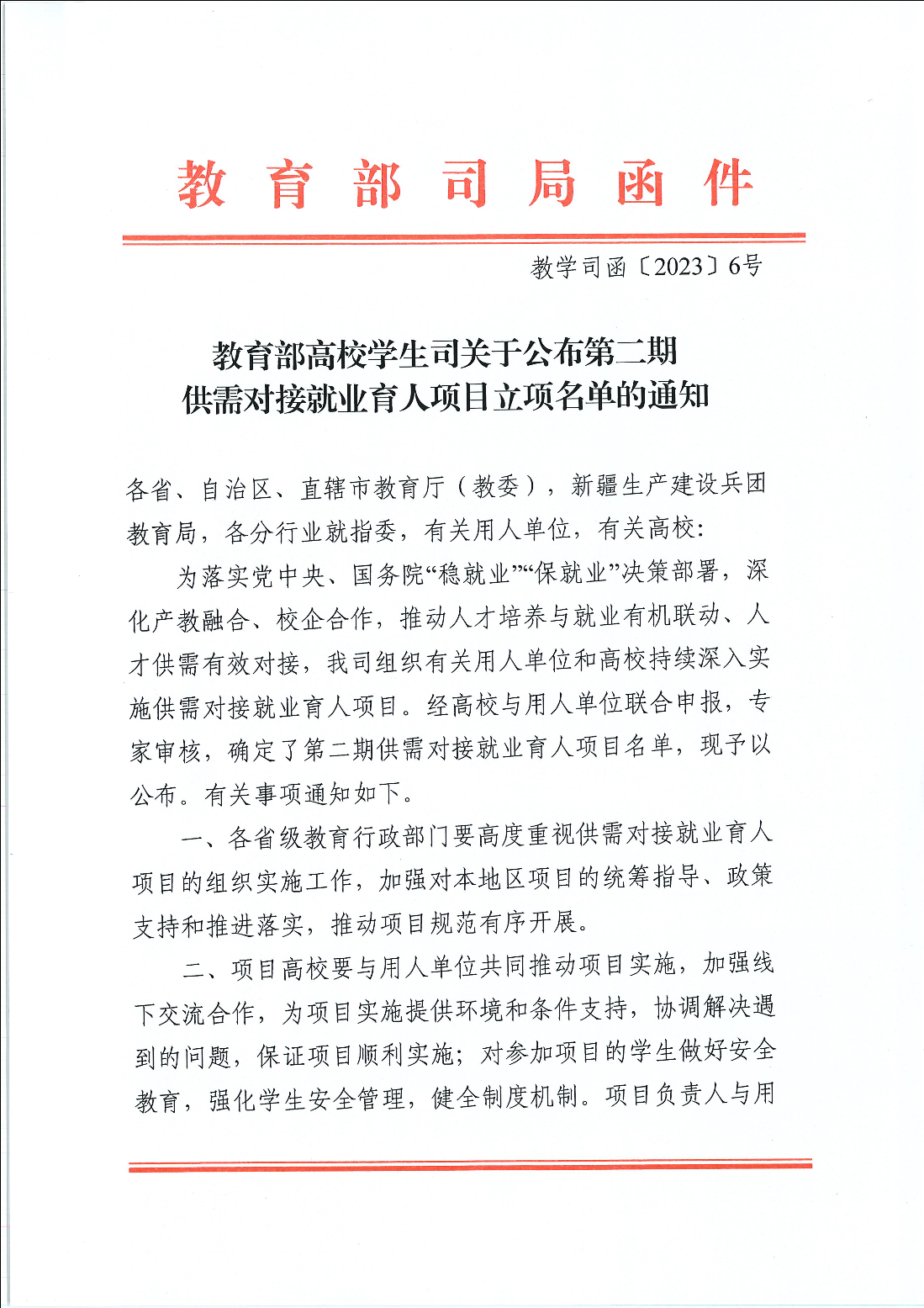 202346日,教育部发布了《教育部高校学生司关于公布第二期供需对接就业育人项目立项名单的通知》 (教学司函〔20236号),经济管理学院申请的6个项目立项成功,其中就业实习基地项目2项,定向人才培养培训项目3项,人力资源提升项目1项。