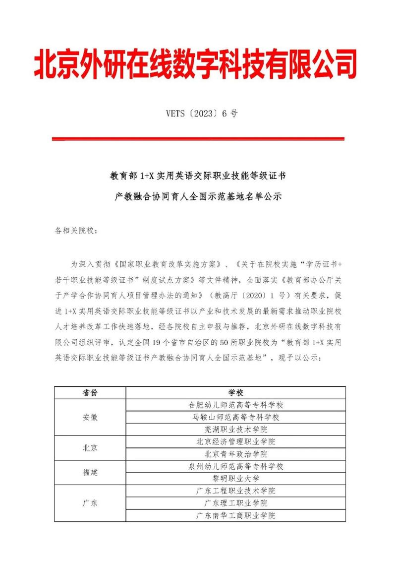 为建设培育具有示范引领效应的产教融合平台和协同育人基地,结合教育部1+X证书最新要求,全方位推动职业外语教育高质量发展,我院商务英语系主任谢慧琪老师主持申报,广州校区与云浮校区商务英语系的教师团队共同努力,项目于2023年申报“教育部1+X实用英语交际职业技能等级证书(简称VETS)产教融合协同育人全国示范基地成功!项目成功获批来之不易,它充分体现“岗课赛证”改革研究与实践、产教融合协同育人模式、“双师型”师资队伍建设等方面领航VETS体系特色。我校于2022年下半年公布《关于修订2022级专业人才培养方案的指导意见》文件,对培养目标与基本要求,明确规定推行“学历证书+若干职业技能等级证书”(1+X)和“学历证书+职业资格证书”(双证书)的制度,为职教改革和职业技能人才培养提供政策支持和方向指引。