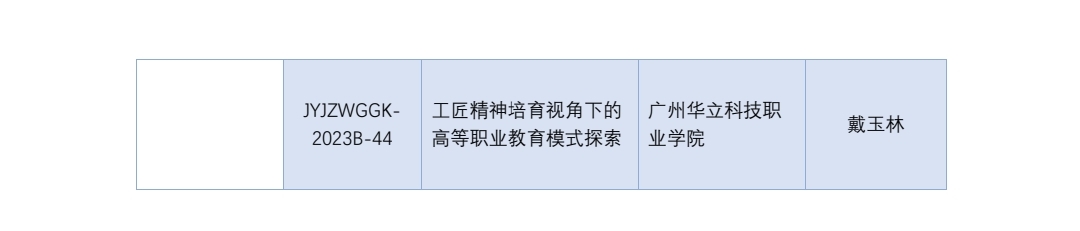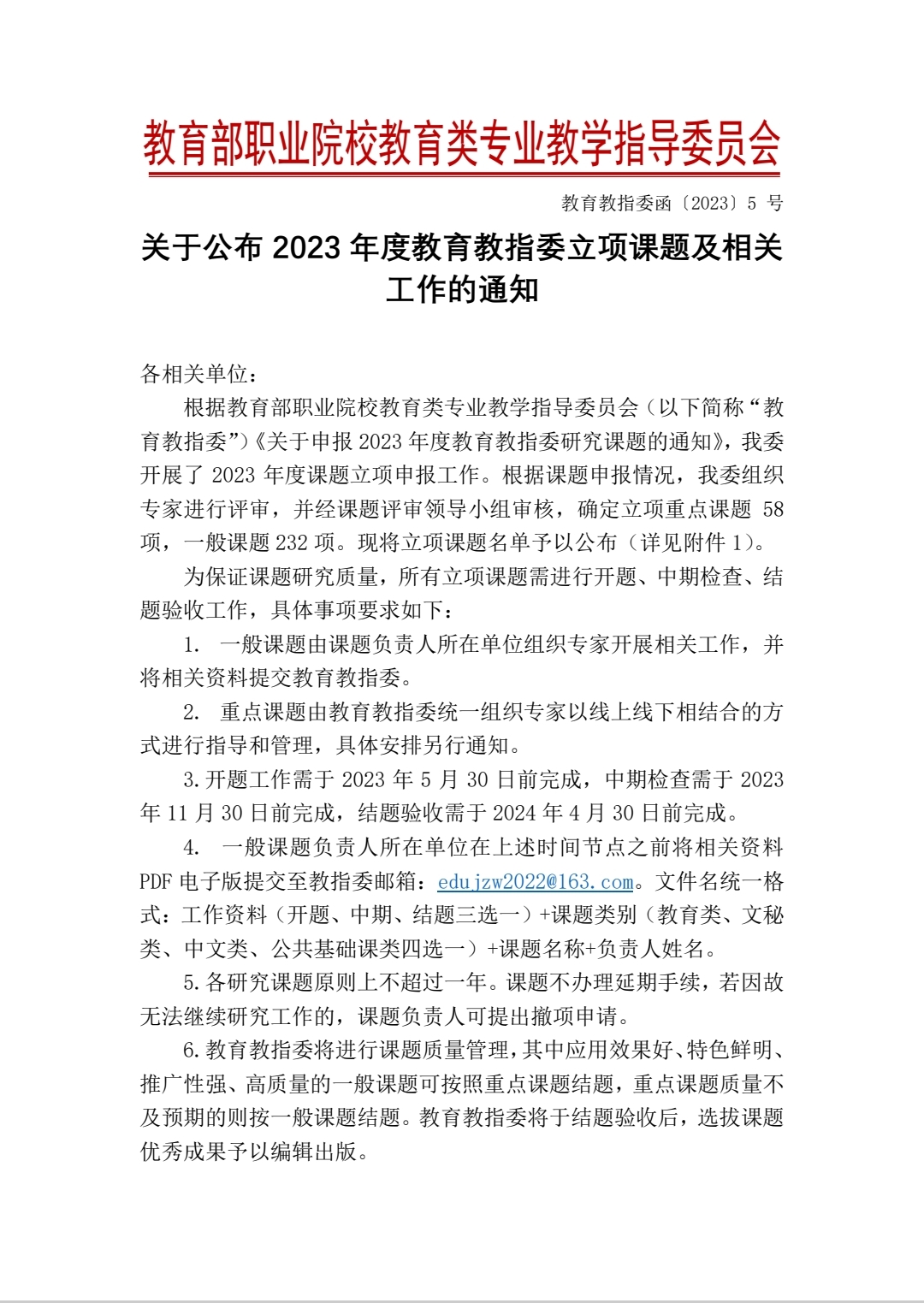 20235月,根据教育部职业院校教育类专业教学指导委员会(以下简称“教育教指委”)《关于申报 2023年度教育教指委研究课题的通知》,教育教指委组织专家进行评审,并经课题评审领导小组审核,确定立项重点课题 58项,一般课题 232项。其中我院戴玉林教授的《工匠精神培育视角下的高等职业教育模式探索》获公共基础课研究课题第一批一般课题立项。