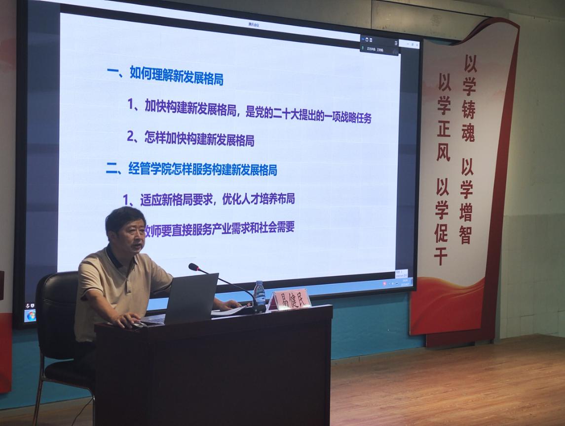 为推动学习贯彻习近平新时代中国特色社会主义思想主题教育走深走实,202367日下午,校长易健民教授、博士应邀到经济管理学院开讲专题党课。易校长将自己研读习近平总书记在《求是》杂志2023年第8期发表的文章4月中旬视察广东的重要讲话、重要指示精神后的所思所感,结合当前国内外宏观经济形势分析,经济管理学院师生党员代表上了一堂立意深远、思想深刻的专题党课。学校科研处处长温伟胜、产教融合办主任刘宇赤,经管学院院长程玉贤、党总支书记朱少先、副院长刘军根以及两校区教师党员和学生代表(校区间视频连线)共100多人参加了此次专题党课学习。