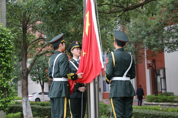 早上7:15分,全体在校生集合完毕。主持人宣布升旗仪式正式开始,国旗护卫队在升旗台下准备就绪,国歌奏响,红旗缓缓升起,全体师生肃立,面向国旗行注目礼。