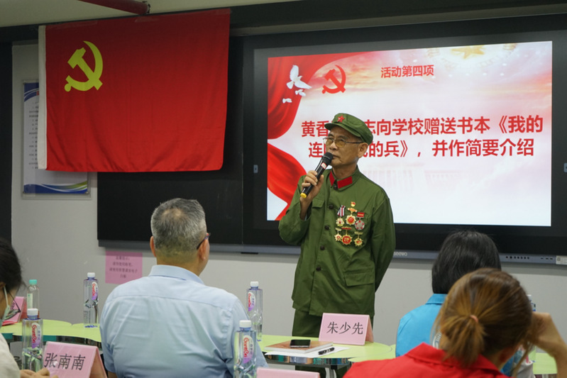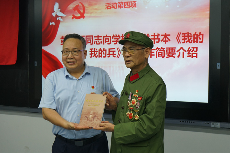 接着,黄香源同志向学院党组织赠送自传体战斗回忆录《我的连队,我的兵》,并作简要介绍。黄老用朴素的语言介绍了他在对越自卫还击战中英勇奋战保家卫国,不顾危险带领指挥“老虎尖刀连”出色完成作战任务的传奇故事,顾老在那场战斗中挺身而出排除地雷阵,并将排出的地雷巧妙布防在我方防御阵地减少我方牺牲,为大部队冲上山峰夺取胜利作出了重大贡献,最后荣获一等战功。