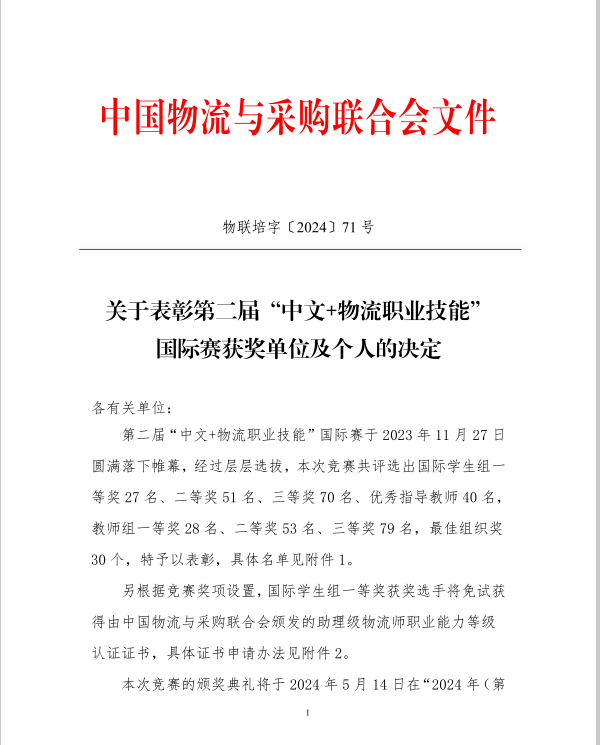 近日,第二届“中文+物流职业技能” 传来喜讯,我院余曼老师荣获第二届“中文+物流职业技能”国际赛教师组三等奖。