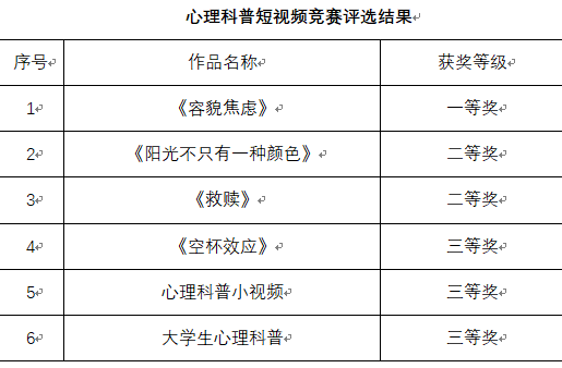 视频比赛作品的内容包涵了心理学概念、生活中的心理学现象、心理知识科普等多个方面;其中有不少作品是知识传播与心理教育并重,具备了一定的专业性和科学性。评委们从创意、内容、技术等多个方面对作品进行了全面评价,通过组织选拔,大赛评选出一等奖1名、二等奖2名、三等奖3名。