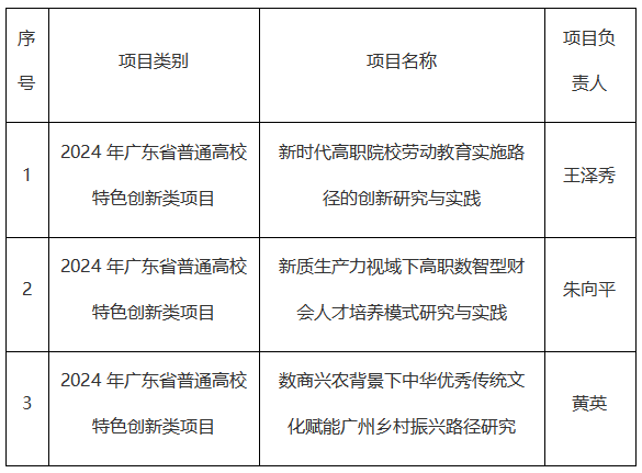 在广东省普通高校认定类科研项目立项中,我院王泽秀、朱向平、黄英等老师立项特色创新类项目。这些项目的成功立项,不仅体现了我院科研工作的持续改革与创新,也充分反映了我院科研工作实力稳步提升。