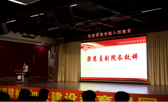 谢晓慧主任首先代表学院对新同学的到来表示热烈的欢迎,她讲到希望新生们认真听讲,通过入学教育尽快适应大学生活。随后,梁慧贞副院长致辞,她向新生们介绍学校概况、发展历史、办学特色及未来规划,增强新生的归属感和认同感。并寄语全体新生:“珍惜大学时光,勇于探索未知、追求卓越。成为有理想、有本领、有担当的时代新人。”