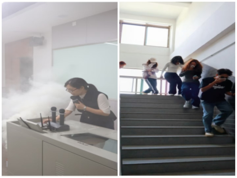 疏散过程中,全体师生冷静、有序,严格遵守了弯腰低姿、用湿巾捂住口鼻沿墙走等安全要领,沿疏散路线安全撤离到集合点(科技楼一楼大厅),用时2分钟,达到了紧张有序、安全高效的预期效果。
