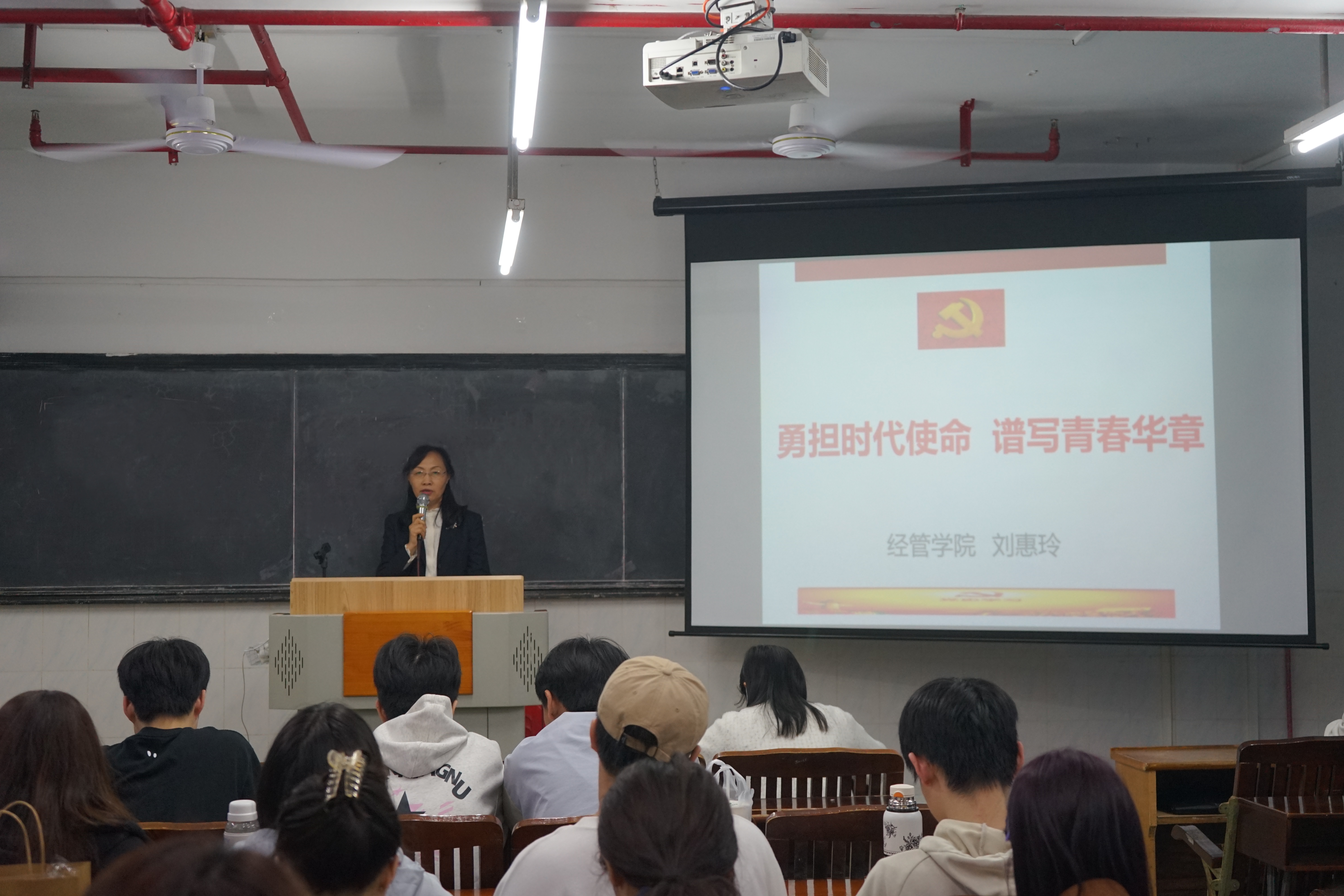授课伊始,刘惠玲同志以 “勇担时代使命,谱写青春华章” 为题,结合当下社会热点与历史案例,深入浅出地阐述了新时代背景下青年所肩负的使命和责任。通过讲述革命先辈投身基层建设、肩负民族复兴大任的事迹,激励学生们勇担时代使命,将个人理想与国家发展紧密相连。